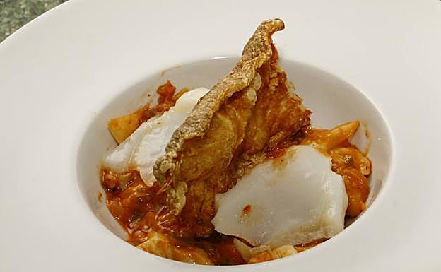 Presentación: Se presenta el sofrito sobre la base del plato, encima el bacalao y se decora con las pieles crujientes.