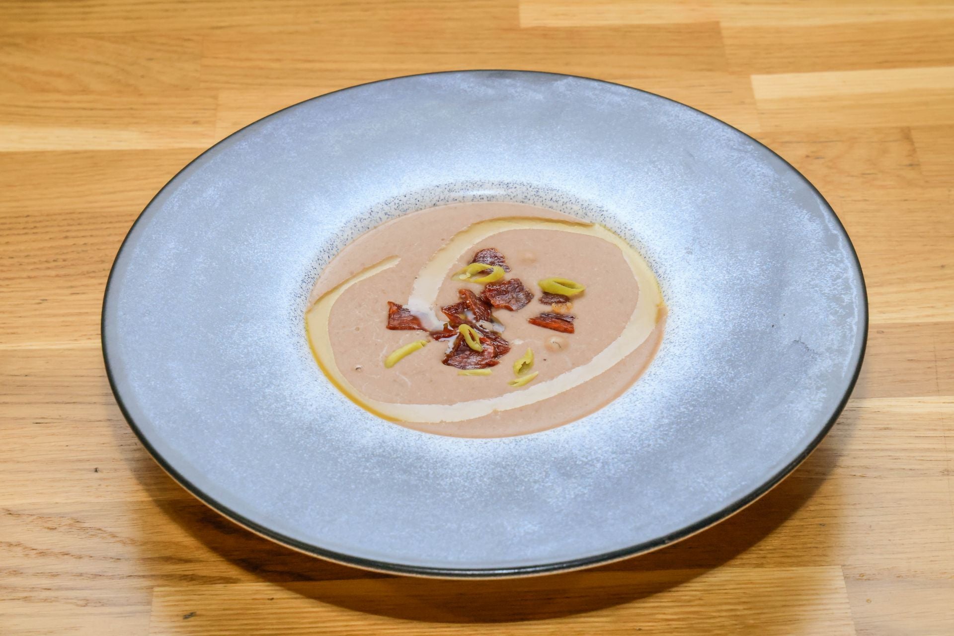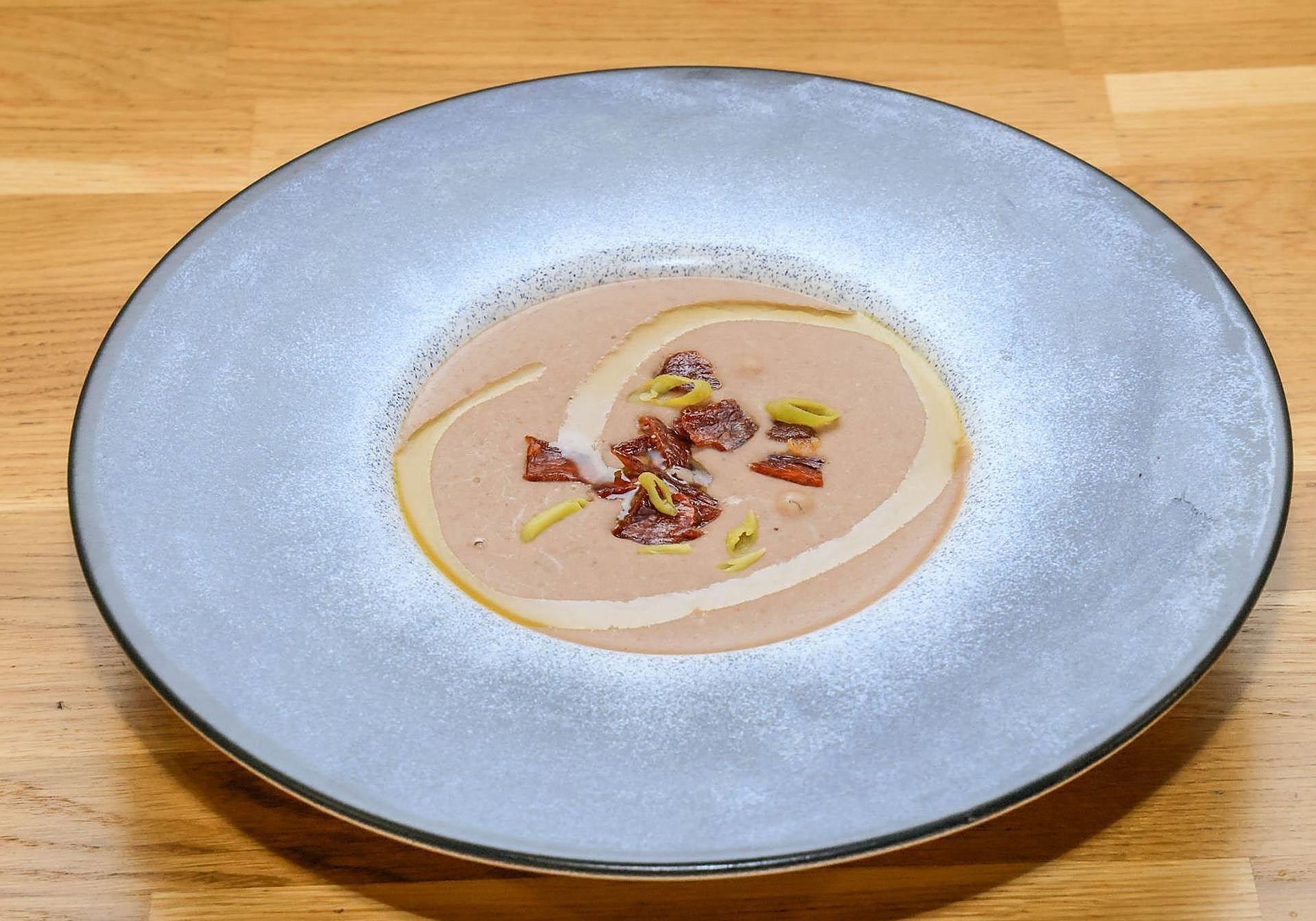 Crema de alubia pinta con jaleo alavés de boletus, jamón y piparra