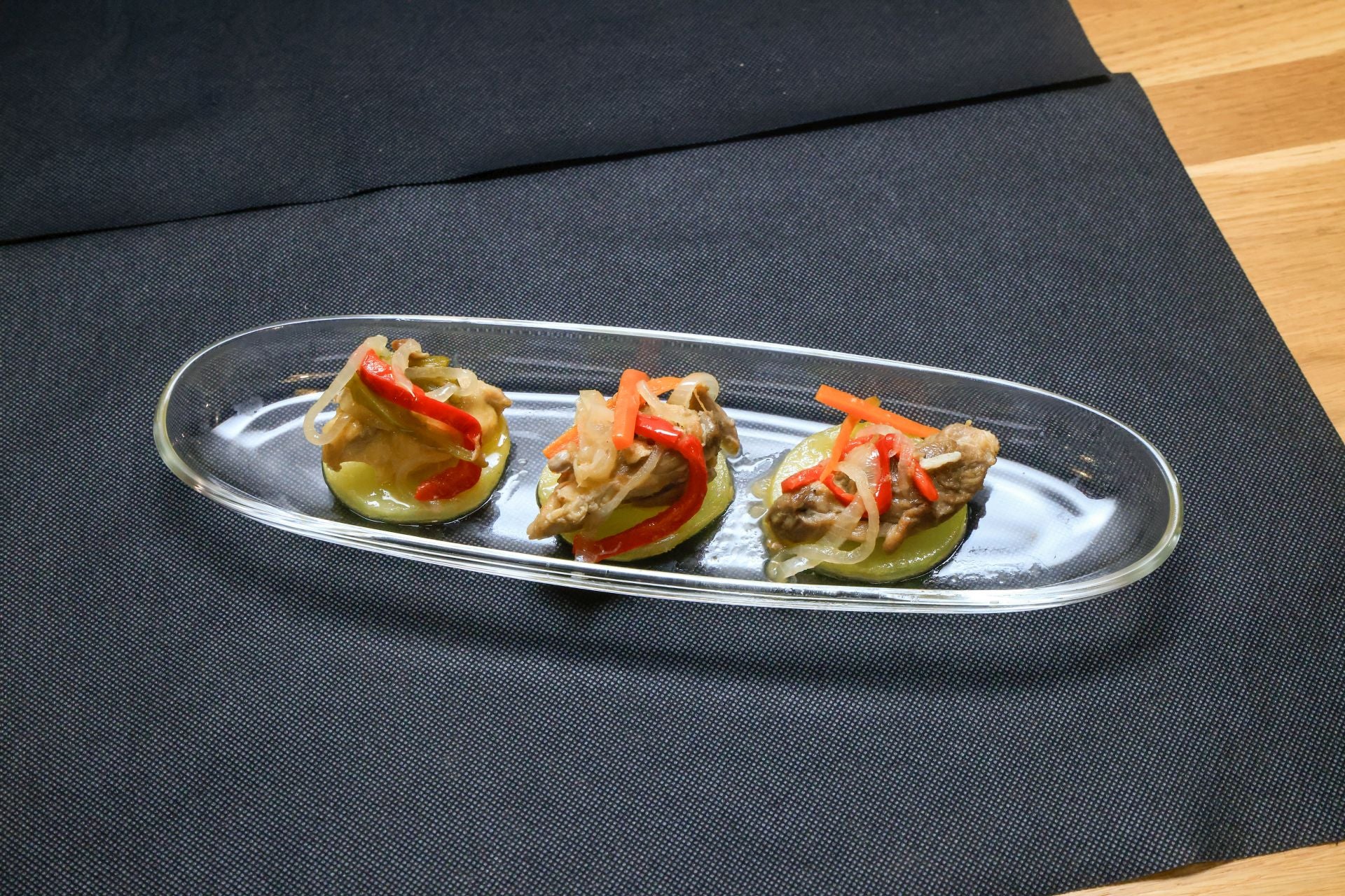 - Se monta el plato, colocando en la base la crema de alubias que hemos preparado y sobre la misma ponemos una lámina de boletus previamente cocinada en abundante aceite y unas piparras.