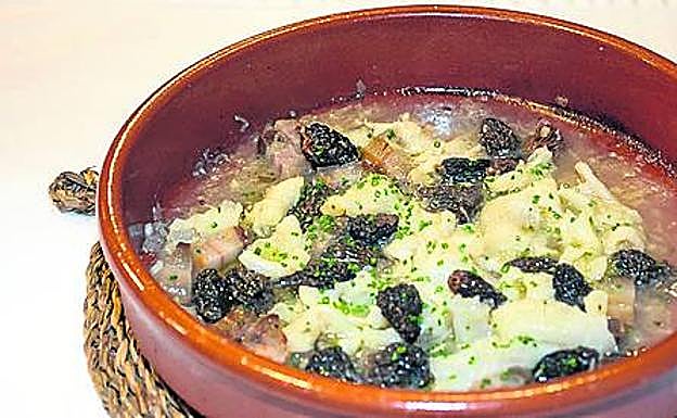 Elaboración: Limpiamos los callos y cortamos a groso modo. Troceamos la panceta en tacos y picamos la chalota. Sofreímos la panceta en un poco de AOVE, añadimos la chalota hasta sofreír también la misma. Cortamos la cocción con vino blanco, Una vez reducido añadimos las colmenillas previamente hervidas, los callos de bacalao y el caldo. Cocinamos cinco minutos a fuego medio, y se presenta con cebollino picado por encima.