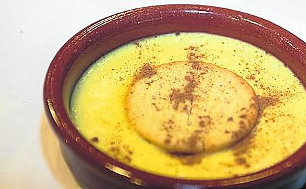 Ingredientes: 500 mililitros de leche, 500 de caldo de garbanzo, seis yemas de huevo, 220 gramos de azúcar, 7 gramos de sal de Añana, esencia de vainilla y canela al gusto, 200 gramos de garbanzos cocidos. Para las galletas de garbanzo: 200 gramos de garbanzo cocido, 150 de harina de arroz, 150 de azúcar blanco, cuatro cucharadas de aceite de girasol, dos cucharadas de agua y cocinar 25 minutos a fuego suave y dejar reposar
