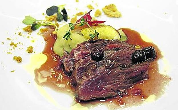 Entraña de ternera con salsa de frutos rojos, cerveza belga y crema de patata alavesa