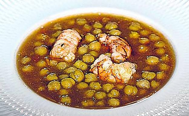 Garbanzos Garlan con verduras y gambones al agua de gotera