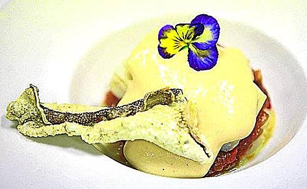 Presentación: Ponemos en el fondo del plato una cama de los callos estofados que tenemos escurridos. Encima, una capa de las verduras pochadas con la salsa vizcaína. Sobre las verduras, el lomo de bacalao y sobre este, la espuma de patata frita. Para culminar el plato, a un lado depositamos una piel de bacalao crujiente encima de la espuma.