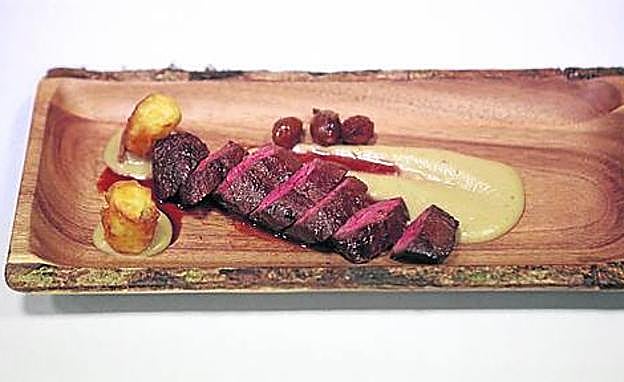 Emplatado: Ponemos una lágrima de salsa en el fondo del plato y en un extremo, unas gotitas. Colocamos el solomillo de pulmón cortado en tataki junto a la lágrima. Al otro lado de las lágrimas ponemos unas cebolletas glaseadas y sobre las gotas de salsa de castañas y hongos ponemos unos cilindros de yuca.