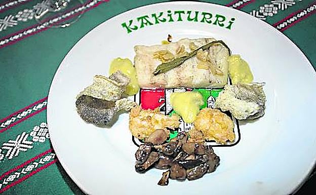 Elaboración: Freír unos ajos laminados, hasta que cojan color. Retirar los ajos y añadir varias tajadas de bacalao para sacar con ellos un pil-pil. En una sartén hacer las cocochas hasta que estén en su punto, sacar y rebozar. Hacer los pimientos en láminas y freírlos. Confitar los hongos previamente cortados en tacos. Colocar las pieles de bacalao en una bandeja de horno hasta que tengan el punto crujiente deseado. Hacer las tajadas de bacalao a la brasa.
