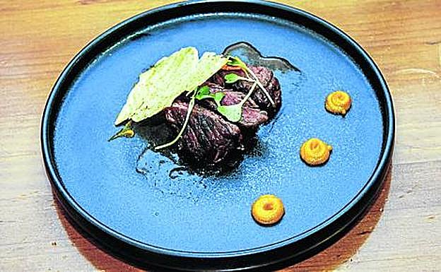Presentación: Con una brocha mojar el fondo del plato con la salsa de asado. Colocar la carne cortada y rematar con los cristales de patata dando volumen. Al lado, colocar tres puntos de puré de boniato asado.