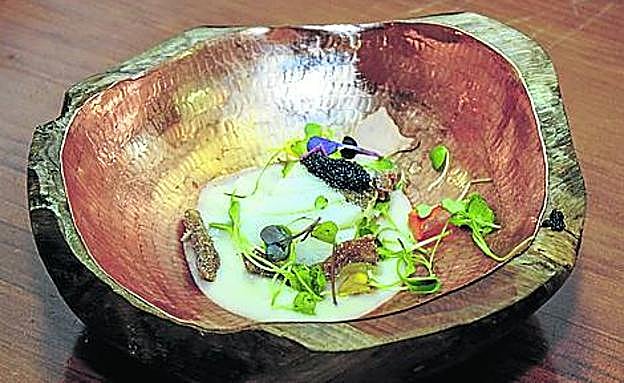 Ingredientes: Un kilo de lomos de bacalao, una coliflor, un kilo de pieles de bacalao, cuatro alcachofas, medio litro de crema de leche, 50 gramos de tobiko, dos dientes de ajo, un tizón de brasa de encina, mantequilla, aceite, sal y dos cucharadas de mahonesa de algas.