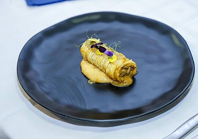 RULO CRUJIENTE DE PATATA, RELLENO DE GARBANZOS CON TXANGURRO, GEL DE COCIDO Y FALSOS GARBANZOS DE CIGALA.