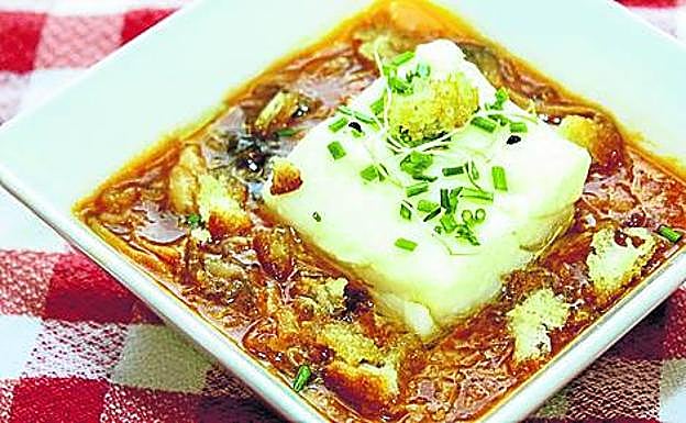 Ingredientes: 800 gramos de callos de bacalao, un puerro, una cebolla, un pimiento verde, medio kilo de tomates, un diente de ajo, una guindilla cayena, una copa de vino blanco de Rioja Alavesa, 600 gramos de lomos de bacalao, cuatro yemas de huevo, pan frito, aceite Arróniz de Rioja Alavesa y sal de Salinas de Añana.