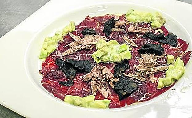 Ingredientes: 250 gramos de solomillo de pulmón en una pieza, una cabeza de ajo, un huevo, un aguacate, 20 gramos de trufa negra de la Montaña Alavesa, 30 gramos de foie de euskal txerri, vinagre de vino de Rioja Alavesa, aceite Arróniz de Rioja Alavesa y sal de Salinas de Añana.