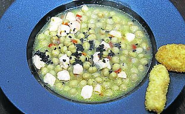 Ingredientes: 500 gramos de garbanzos de Garlan, dos txalotas, dos pimientos verdes, tres pimientos rojos frescos, 500 gramos de salmón fresco, AOVE Arroniz de Rioja Alavesa, sal de Añana y trufa de Motaña Alavesa