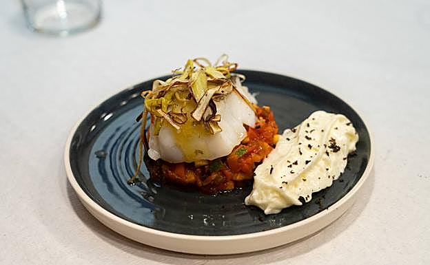 BACALAO AL PIL-PIL CON PUERRO FRITO, SOBRE CAMA DE PISTO Y ACOMPAÑADO DE ESPUMA DE PATATA ALAVESA CON TRUFA