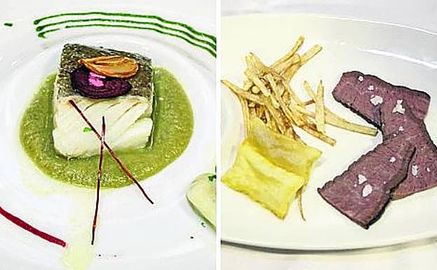 La sociedad asentada sobre el antiguo bar-restaurante Orense, todo un clásico en el Casco Viejo, también mimó sus platos a concurso. Tanto como que Gojenola, reconocido y premiado artista de pincel, trazó «algunas fantasías para sorprender» alrededor de la pieza de pescado. Para escapar de la rutina. «Queremos poner como elemento decorativo unas líneas paralelas porque parece que los emplatados que vemos a los grandes maestros son como muy conocidos. Queremos dejar esa idea de paralelismo, cambiar la disposición de los elementos sin alterar demasiado los platos». Entre los adornos coloridos destacaba, eso sí, un hermoso taco de bacalao confitado con sus kokotxas al pilpil, una crema de pimiento verde y patata y un fumet de pescado, todo ello cocinado entre Koldo y Aritz Expósito. «Estaba en un punto inmejorabe, es imposible rizar el rizo más. Quizás le sobraba a la crema un poco de patata, áspera en boca, pero estaba muy rico, jugoso y en su punto de temperatura», escrutó Basterra.