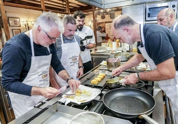 Contaba Fernando Gonzalo-Bilbao, el incombustible guisandero de Ametza, que se han pasado «dos meses» dándole al bolo y a los fuegos en largas sesiones preparatorias porque esto de montar dos pintxos «es muy complicado», más propio de «los profesionales» de la cocina que de los chicos de los txokos. En sus devaneos, a ellos se les ocurrió montar una pequeña caja de patata confitada, vaciarla, freirla para darle un toque crujiente, rellenarla con tortilla de bacalao y coronarla con un huevo de codorniz frito, pilpil y cebollino picado. «Le da mucho sabor» en la boca, advirtió el improvisado chef Javier García-Mendaza, uno de sus ideólogos. «El bloque de patata no se ha derrumbado, el bacalao estaba en su punto, caliente, bien de sal, y me ha gustado el huevo de codorniz. Un toque diferente, me ha encantado», apreció Armando Ochoa, que participó en las deliberaciones como representante de la anterior sociedad a concurso, Txoritokieta.