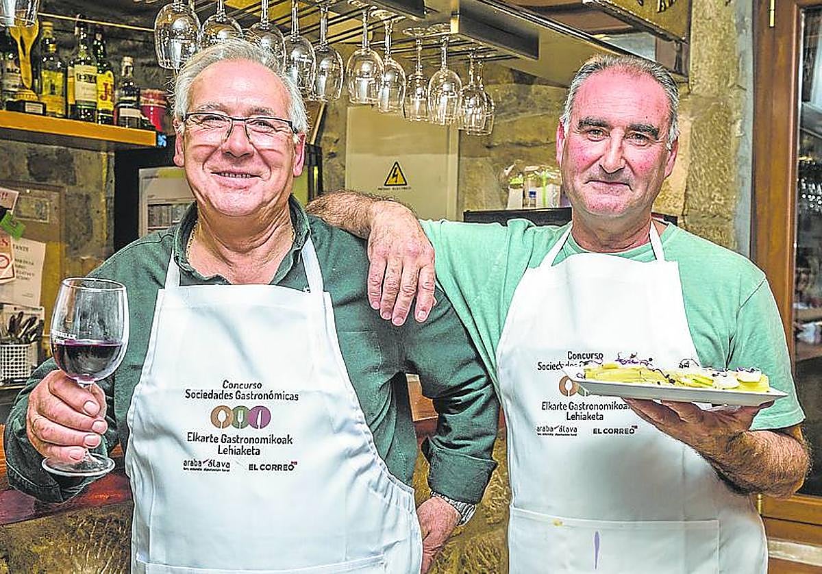 Claro que en esta faena gozan de una gran ventaja. Esta cuadrilla que empezó a cocinarse allá por 1978 cuenta con miembros de Álava, pero también de Bilbao, San Sebastián, Zaragoza o incluso ciudades de Francia. Y claro, pueden pillar un poco de aquí y otro poco de allá hasta dar con el menú más sabrosón. La ejecución de esta obra recayó en las manos de Ernesto Chávarri y Luis Javier Uribe, que cambiaron la vendimia por la cocina. Porque hace un par de días estaban entre lagos y ahora elaborando los pintxos que han dejado buen sabor de boca.