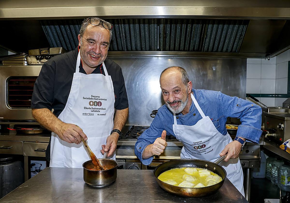 Al mando de la embarcación se pusieron Mikel Urteaga y Tomás Rojo, dos amantes de la buena cocina y con mucha mano en los fogones. «Pero la cocina tradicional ehh, que al final esa es la esencia de una sociedad gastronómica. La forma del pintxo tiene aromas vanguardistas, pero en el fondo somos fieles a la tradición que se respira en los txokos», puntualizan tras concluir la hazaña y brindar por la ejecución con el vino de las bodegas Zintzo. Al igual que cuando jugaban al rugby, esto va de hacer ensayos y ensayos hasta conseguir ganarse el paladar del jurado.