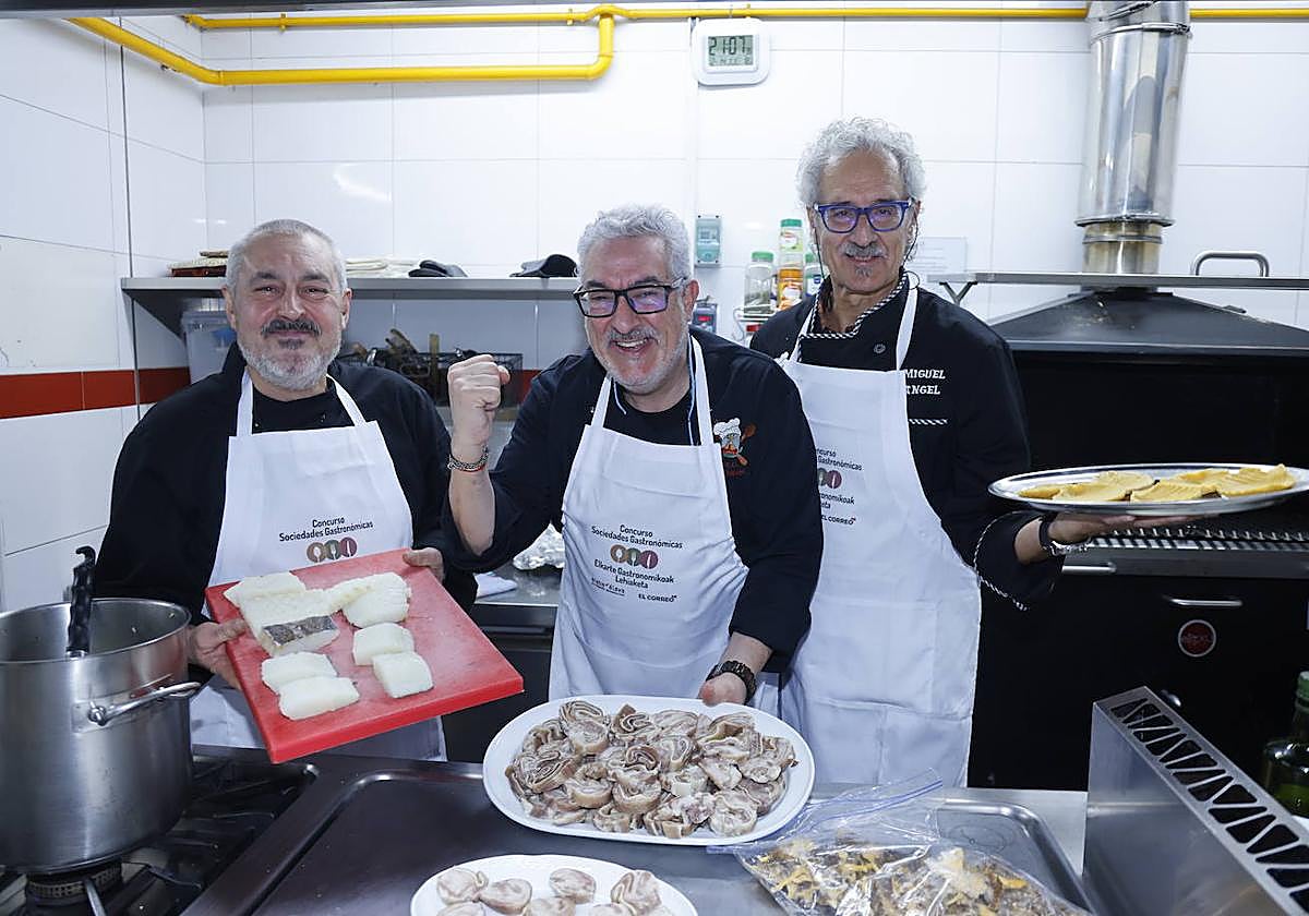 Sin perder de vista la cocina tradicional, de la que hacen bandera, en el primero de los pintxos dejaron espacio para la innovación. Solo así se entiende que a partir de un guiso tradicional, en el que los garbanzos de Garlan reinaban, creasen unas zamburiñas. Esas Conchas de Oro -por el sabor de cine que tenían- que remataron con las orejas de cerdo. Aunque lograrlo tuvo su aquel. «Llevábamos tres semanas intentando darle la forma, pero se nos rompía siempre. Lo hemos conseguido a pocas horas del concurso», respiraban aliviados Arturo Fernández de Pinedo, Pruden Cuenca y Miguel Ángel González, los chefs de la sociedad.