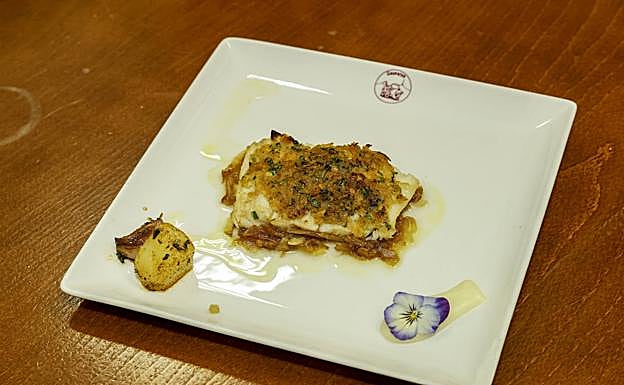 Bacalao con costra de cítricos sobre cama de cebolla al vermut