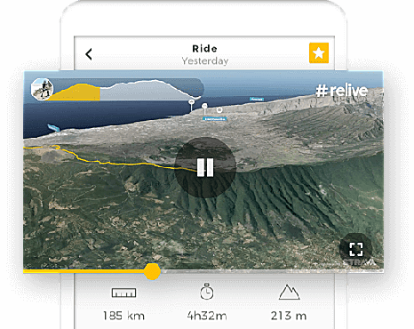 Entre las opciones de Relive, la más llamativa es la creación automática de vídeos sobre nuestros paseos en bicicleta. Hablamos de infografías tridimensionales al estilo de las retransmisiones televisivas, con marcadores de ruta; datos de elevación o velocidad máxima... También se intercalan las fotografías y vídeos que hayamos tomado, geolocalizándolos.