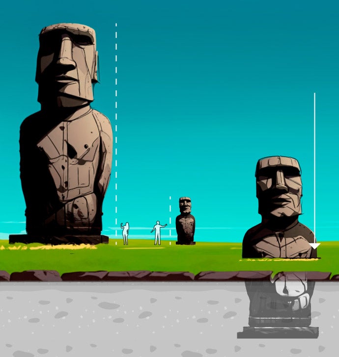 A menudo se presentan los moáis como grandes cabezas y bustos, pero lo cierto es que generalmente son esculturas de cuerpo completo que subyacen semienterradas