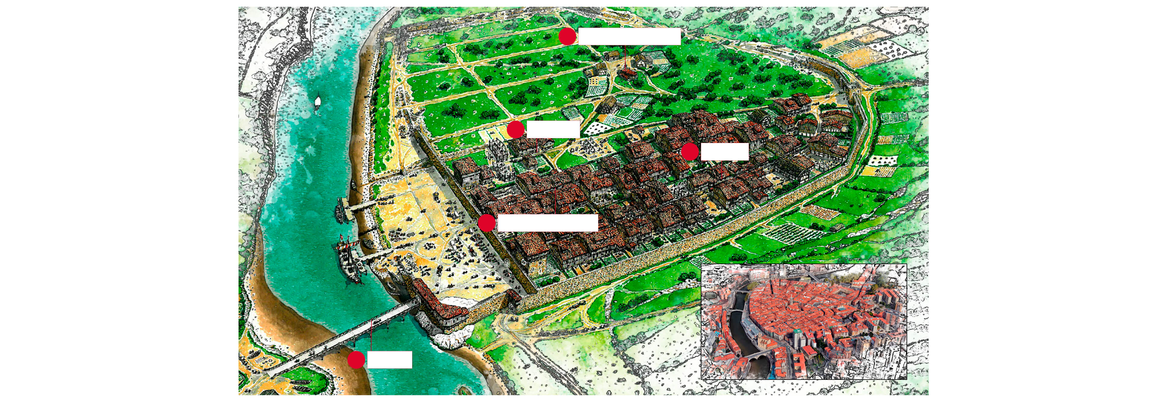 De este modo, en una conversación que en principio tenía por objeto valorar su trayectoria al frente del museo y repasar su labor de campo en diversas excavaciones, surgen de nuevo estos resultados, especialmente a la vista de unas láminas que, siendo fieles en buena parte a la realidad y teniendo un gran valor artístico, reproducen este, a juicio del experto, error inmortalizado a través de los años: entre la lámina correspondiente al 1300, año de fundación de la villa, y la de 1450, donde se puede apreciar el Casco Viejo completamente formado y edificado dentro del límite de la muralla, hay otra lámina que representa al Bilbao de 1350, donde tres calles se levantan por completo con sus viviendas y comercios, mientras que el resto, las otras cuatro vías, son apenas huertas, una zona desdibujada, ni siquiera protegida, pues la muralla tan solo aparece en la zona lindante a las tres calles, Tendería, Artecalle y Somera, y poco más allá.