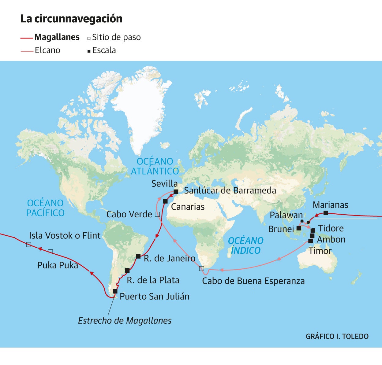 La Biblioteca Foral de Bizkaia acoge una muestra que conmemora la primera circunnavegación de la Tierra y homenajea a Elcano con reproducciones perfectas de joyas únicas de la cartografía«Este es el 'Atlas Vallard', de 1547», señala el editor Manuel Moleiro. En la página por la que está abierto se ve una costa trazada con detalle y en el interior aparecen dibujados varios indígenas, desnudos, armados con arcos. Entre ellos, el que parece ser un jefe está negociando con unos europeos. «Es el extremo Sur de América, aquí arriba se ve el estrecho de Magallanes». ¿Arriba? Hay algo raro en este mapa... «Sí», dice el editor, sonriendo. «Una curiosidad de este Atlas es su orientación. En sus mapas el Norte está hacia abajo y el Sur hacia arriba, al modo de los cartógrafos musulmanes».
