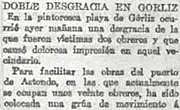 Doble desgracia en Górliz. En la pintoresca playa de Górliz ocurrió ayer mañana una desgracia de la que fueron víctimas dos obreros y que causó dolorosa impresión en aquel vecindario. Para facilitar las obras del puerto de Astondo, en las que actualmente se ocupan unos veinte obreros, ha sido colocada una grúa de movimiento a brazo. En esta grúa trabajaban hoy a las nueve menos cuarto los obreros José María Zarandona, de 37 años, natural de Larrabezúa, casado y con cuatro hijos, y Bonifacio San Miguel de 36 años, de Bedia, también casado y con tres hijos. Al cambiar la posición de la grúa para que Bonifacio colocase una piedra de unos 200 kilos de peso, el extremo de la pluma tocó en un cable de alta tensión de la línea que desde el Sanatorio conduce energía para el movimiento de una bomba que absorbe agua del mar para los depósitos del referido Sanatorio. Los dos obreros sufrieron una terrible descarga, quedando electrocutados (...). Un sacerdote que veranea en Plencia y que se encontraba casualmente en la playa administró a las víctimas la extrema unción 'sub conditione' (...). Los cadáveres fueron trasladados al cementerio, donde se les practicará la autopsia. El contratista de la obra sufrió tal impresión por la muerte de los dos obreros que hubo de ser asistido en el Sanatorio. Entre el numeroso público que llegaba a aquella hora a la playa, causó la desgracia general sentimiento y muchos bañistas se retiraron a sus casas sin bañarse.