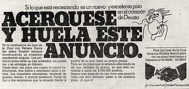 «Si lo que está necesitando es un nuevo y excelente piso en el corazón de Deusto», decía el anuncio, la esquina de Rafaela Ibarra y Juan de la Cruz (la actual Blas de Otero) era una buena elección. Los primeros pisos se iban a entregar a comienzos de 1980: eran viviendas muy amplias y se vendían a partir de 3,7 millones de pesetas. Hoy, el precio de los de cuatro habitaciones puede haberse multiplicado por dieciocho, hasta los 400.000 euros.