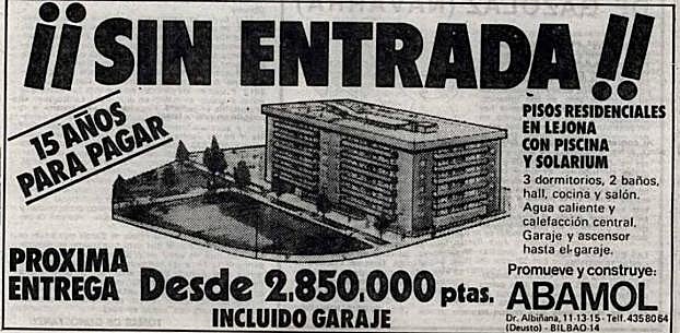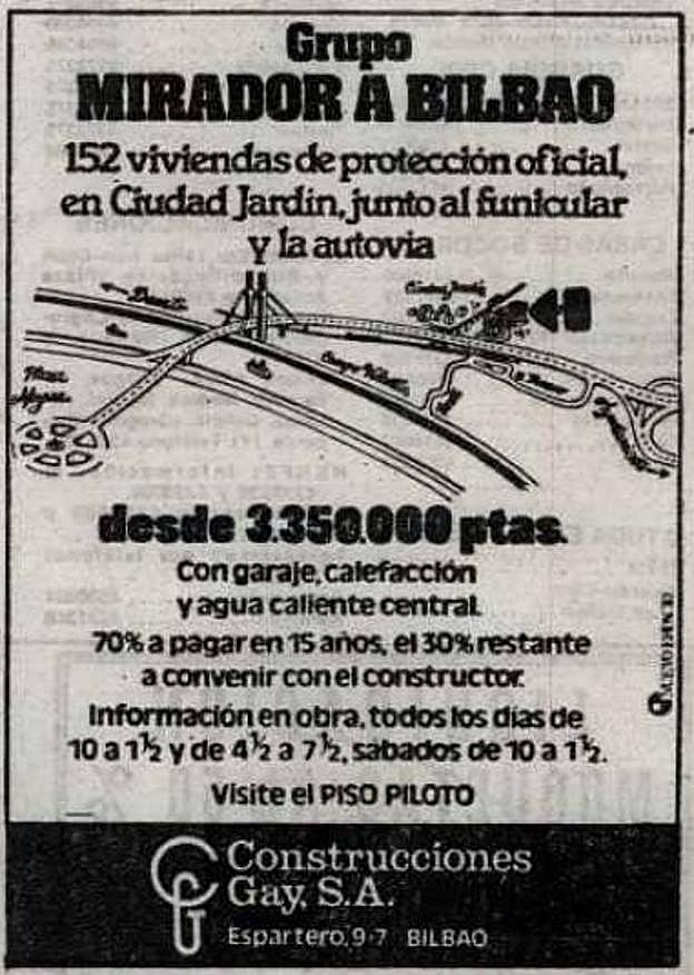 Comprar un piso nuevo podía costar dos millones y medio de pesetas: ese era, por ejemplo, el importe mínimo en 1979 de las viviendas de Aixe-Ona, uno de los grupos que se habían levantado a lo largo de los 70 en Otxarkoaga. Los anuncios destacaban su proximidad al colegio Veracruz y los espaciosos cuartos de estar de 28 metros cuadrados. En la calle Esteban Bilbao del «Ensanche de Begoña» (la actual Gabriel Aresti, en Txurdinaga), se iniciaba entonces mismo la construcción de 48 viviendas de 107 metros cuadrados, con «ascensores-descensores» y calefacción y agua caliente centrales, que costaban 3,1 millones de pesetas, garaje incluido. Y a partir de 3,3 millones se vendían los pisos de protección oficial de Mirador a Bilbao, en Ciudad Jardín, «junto al funicular y la autovía» y también con garaje. En la Curva de Elorrieta, en un inmueble también en construcción, los pisos más baratos (de tres habitaciones y con garaje) costaban 3,1 millones. «Su situación es ideal -argumentaba la publicidad, adelantándose a los escépticos-, lo suficientemente cerca y lejos para vivir feliz y cómodamente por muchos años».