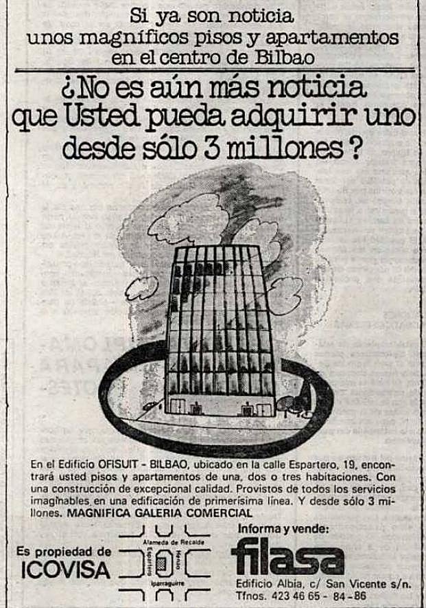 «Magníficos pisos y apartamentos» en la calle Espartero, la actual Juan de Ajuriaguerra: es la promoción del edificio Ofisuit, «una edificación de primerísima línea» y provista de una «magnífica galería comercial». Los precios más bajos eran de tres millones de pesetas. Hoy, según los expertos de la Inmobiliaria Irizar, los apartamentos de una habitación cuestan 300.000 euros (dieciseis veces el precio original), mientras que los de dos se elevan a 425.000 y los de tres, a 550.000.