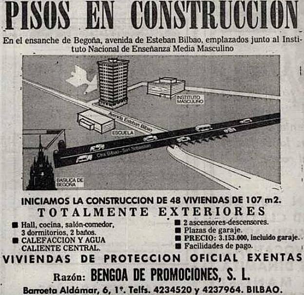 Pisos en construccion en «el Ensanche de Begoña», en la calle Esteban Bilbao (actual Gabriel Aresti). Totalmente exteriores y con garaje, se vendían a partir de 3.153.000 pesetas. Hoy pueden rondar los 310.000, dieciséis veces más.