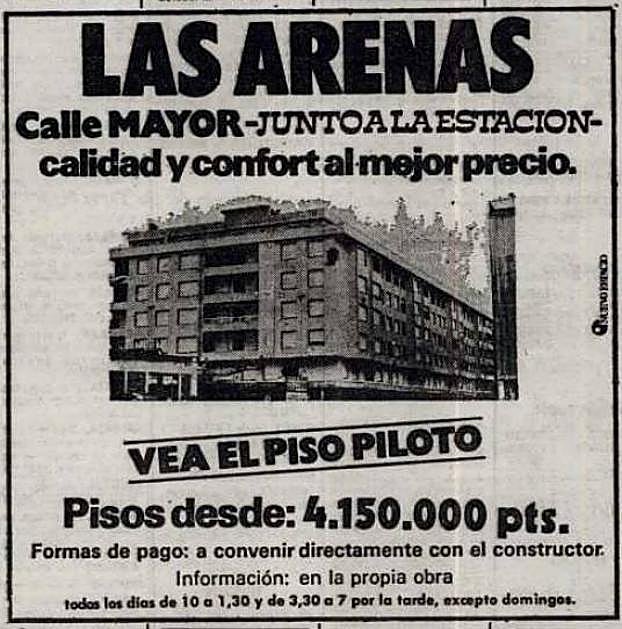 Un vistazo fuera de Bilbao: una de las promociones de viviendas más caras que se anunciaban en la prensa de hace 40 años estaba en la Calle Mayor de Las Arenas, junto a la estación. Los 4,1 millones de pesetas de entonces, precio de las viviendas más pequeñas, se han convertido hoy en 300.000 euros.