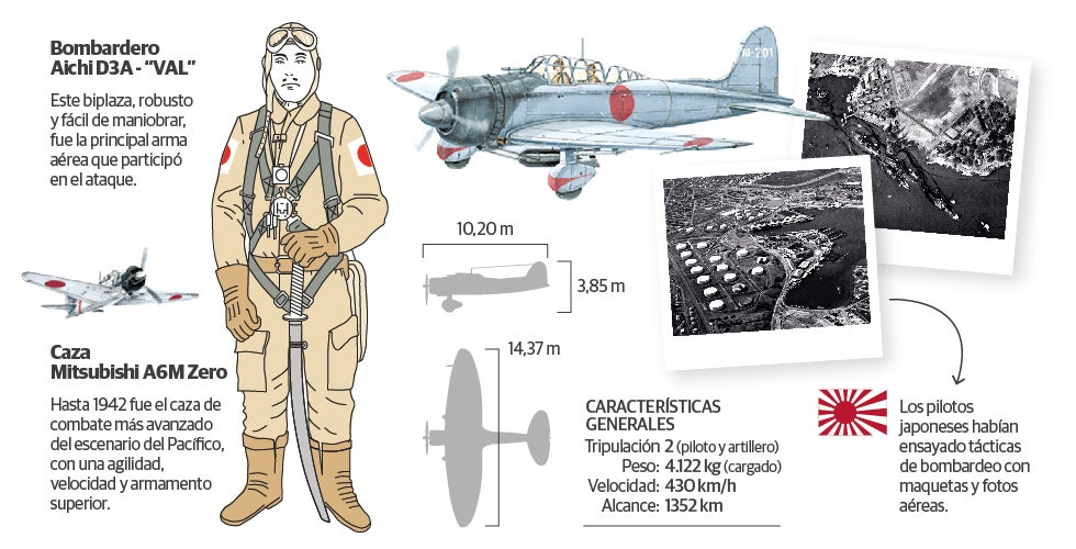 Por negligencia o, según algunos teóricos de la conspiración, porque no interesaba, nadie dio la alarma hasta que fue demasiado tarde. Bombas y torpedos cayeron sobre los barcos amarrados y los aeródromos militares, en los que los cazas permanecían estacionados ala con ala y con los depósitos vacíos para evitar sabotajes. La flota amarrada tuvo que defenderse por sus propios medios antiaéreos.