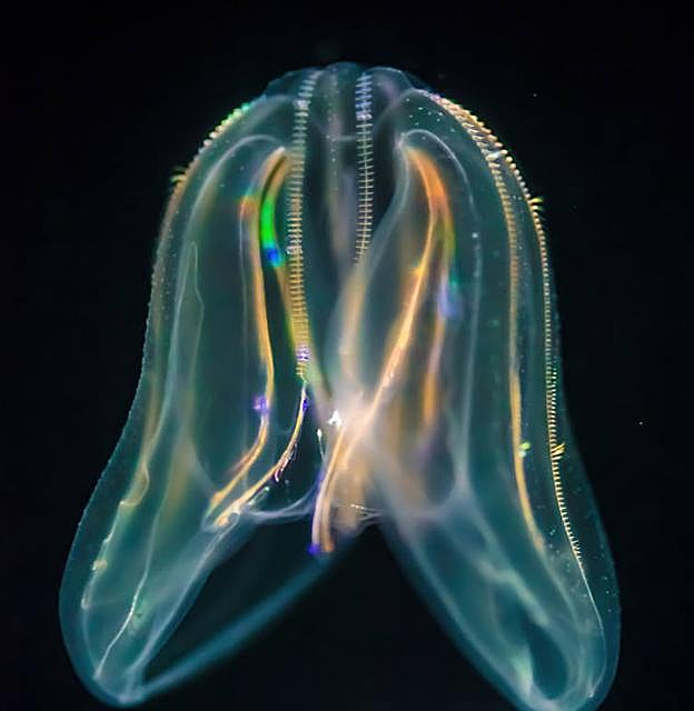 Si vemos por el mar un lazo traslúcido que brilla y emite destellos de colores a la luz del sol..., ¿lo cogemos? Pues no conviene ceñírselo a la cintura, porque es una medusa peine o ctenóforo, un animalito que apenas ha cambiado en quinientos cuarenta millones de años. Su manera de reflejar y refractar la luz y su forma le han valido el nombre de 'cinturón de Venus'. «Es una de las criaturas más hermosas y extrañas que existen».