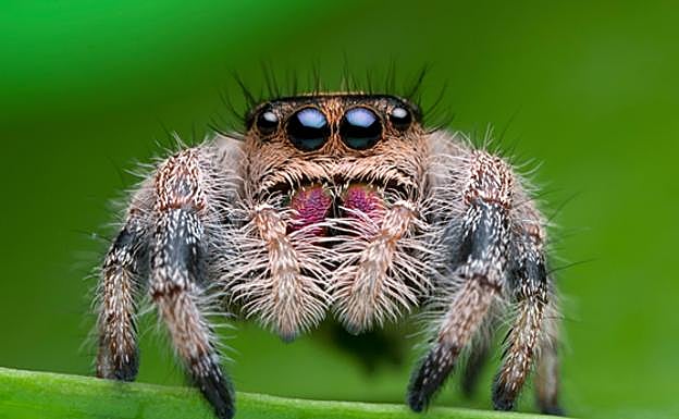 Vive en Norteamérica y es una cazadora implacable. La P. Mystaceus tiene dos pares de ojos frontales, «lo que le permite escudriñar grandes secciones del mundo que les rodea», explica el escritor. Y usa su agudeza visual -algunas 'parientes' tienen este sentido más desarrollado que un gato- para devorar abejas y otras arañas, sus platos favoritos. Si no las matan antes del susto, porque, además de su colección de ojos, tienen una especie de bigotes blancos y mechones negros que hacen que pensemos en monstruitos de ciencia ficción. Y su manera de saltar... pueden dar un brinco equivalente a 50 veces la longitud de su cuerpo y aterrizar con precisión. ¿Más habilidades? Sí. Saben 'bailar' de un modo muy curioso para intimidar a sus adversarios o 'seducir' a sus parejas.