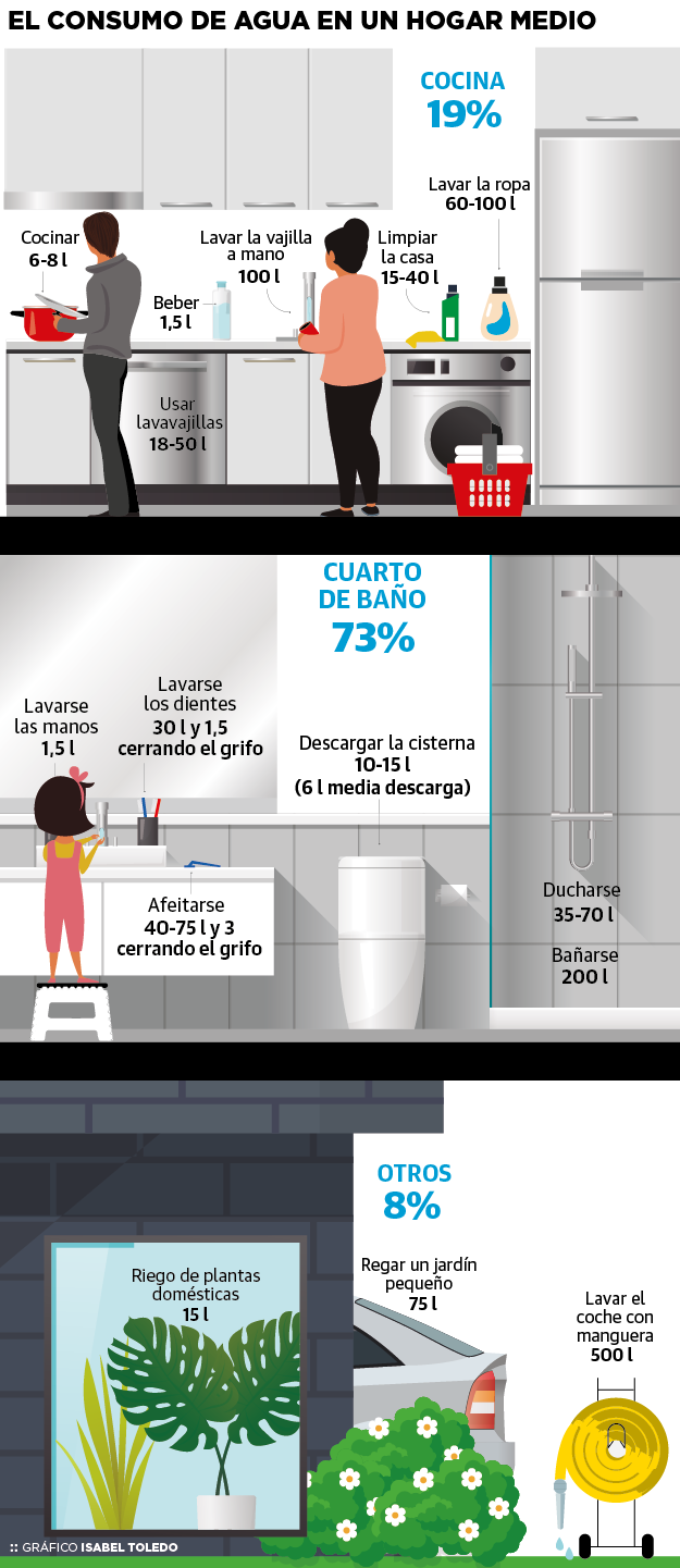 El baño es, con diferencia, el lugar de la casa donde más agua se consume. Concretamente, dos tercios del total. De ahí que la mayoría de los consejos de los expertos para evitar el despilfarro se centren en esta zona de la vivienda. El gesto que más ahorra y que todos tenemos en la cabeza es cambiar la bañera por una ducha rápida de cinco minutos. Pero no es el único. Otra medida muy sencilla es cerrar los grifos. «Compruebe primero que son eficientes y no los tenga abiertos mientras se lava los dientes, se afeita o se enjabona...», aconsejan en la Organización de Consumidores y Usuarios. Para saber si los grifos expulsan más agua de la necesaria, hay que dejarlos abiertos durante medio minuto. «Si durante ese tiempo recoge más de cuatro litros, son derrochadores», advierten los expertos de la OCU. En ese caso, la solución pasa por cambiar toda la grifería de la casa por otra más moderna y eficiente, aunque existen en el mercado medidas intermedias para reducir el consumo de agua en los grifos, como la instalación de limitadores de caudal, temporizadores o aireadores, que hacen que el agua salga en forma de perlas.