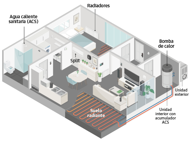 Cuando se habla de sistemas de climatización por bombas de calor, los expertos del sector se refieren básicamente a dos: los llamados 'aire-aire', una solución que requiere una instalación muy parecida a la del aire acondicionado y sirve tanto para calentar como para enfriar la casa; y la fórmula 'aire-agua', que calienta agua en lugar de aire y se distribuye por la vivienda a través de suelo radiante o radiadores. La primera se puede instalar en casi todas las casas sin grandes obras y «económicamente casi siempre resulta rentable», mientras que la segunda exige una inversión inicial elevada (a partir de 8.000 euros, según los estudios de mercado realizados por Selectra y la OCU) y no se puede colocar en todas las viviendas.