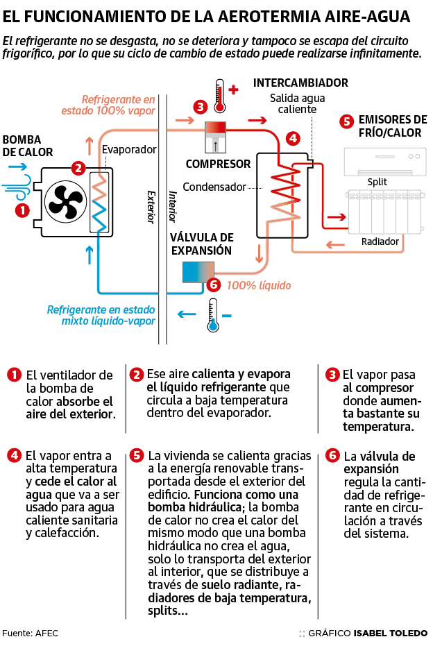 La aerotermia 'aire-agua' es una «muy buena opción para casas unifamiliares o de nueva construcción», explica Pedro Ruiz. Sin embargo, no suele compensar en pisos particulares, sobre todo si son pequeños. Además del importante desembolso inicial, este sistema exige la instalación de una unidad externa para la que no siempre hay espacio o, directamente, no se puede poner porque afecta a la estética de la fachada. «En esos casos, lo mejor es plantearse una instalación centralizada de la que se sirva todo el edificio. Es decir, que todos los vecinos del bloque se pongan de acuerdo para instalar este sistema de calefacción», añade el experto.