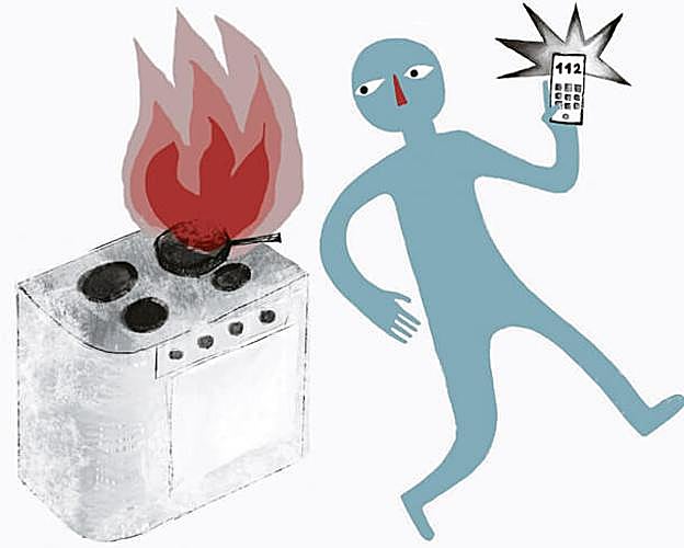 Si el incendio en casa se acaba de producir y es poco intenso –prosigue Carlos Martínez–, como que arda el aceite de la sartén, hay que intentar apagarlo con trapos o toallas secas, cubriendo el fuego para que no se alimente con oxígeno. Es interesante tener en casa pequeños extintores (necesitan mantenimiento anual). En caso de que el incendio sea más grande y no podamos controlarlo, hay que abandonar la vivienda cuanto antes siempre que sea posible, evitando el ascensor y bajando por las escaleras, y dar aviso a los equipos de emergencias del 112. Si no es viable salir, iremos cerrando todas las puertas tras nosotros, poniendo trapos o toallas empapadas en agua entre las puertas y el suelo para evitar que penetre el humo, y nos colocaremos cerca de ventanas o balcones para que los equipos de emergencia nos vean fácilmente y puedan rescatarnos.