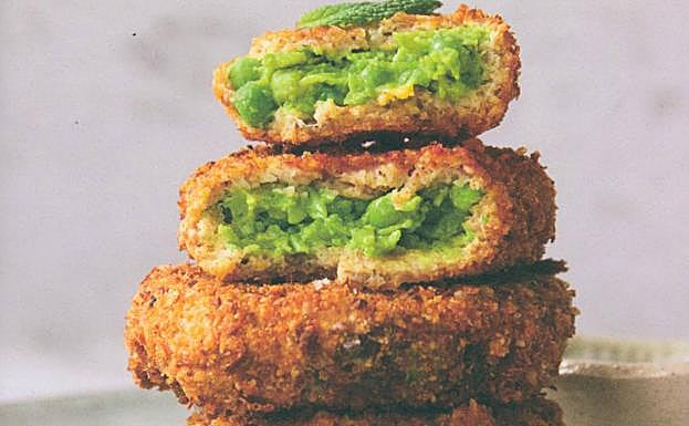 250 gramos de guisantes congelados. Ralladura de un limón. Zumo de medio limón. 2 cucharadas de menta picada. 2 cucharadas de parmesano. 1 cucharada de harina. 3 huevos. 100 gramos de copos de maiz sin azúcar (o pan rallado), aceite de oliva, sal, pimienta y un yogur griego.
