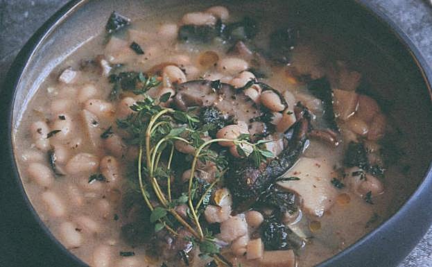 4 cucharadas de aceite de oliva. Una cebolla picada. 2 dientes de ajo. Tomillo. 200 gr. de setas variadas, 100 ml. de vino blanco. 2 cucharadas de salsa de soja. 800 gr. de alubias blancas cocidas. 2 láminas de alga nori. Un litro de caldo de verduras. Zumo de medio limón. Sal y pimienta.