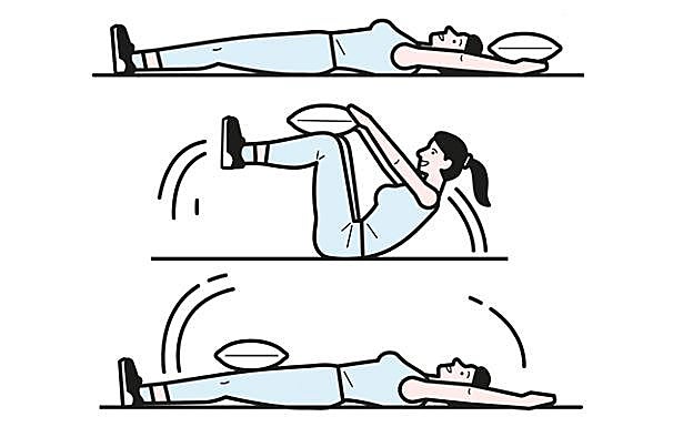 Túmbate en el suelo con los brazos estirados por encima de la cabeza y agarra un cojín. Eleva el tronco, empezando por la cabeza y redondeando la espalda, hasta sentarte. Al mismo tiempo, flexiona las rodillas en ángulo recto. Acompaña el movimiento con los brazos y, al sentarte, deja el cojín entre las piernas. A continuación, lleva la espalda hacia atrás, redondeándola hasta tumbarte, mientras estiras las piernas hacia delante sin tocar el suelo y sin que se caiga el cojín. Vuelve a elevar el tronco hasta sentarte y flexionar las rodillas en ángulo recto, simultáneamente. Agarra el cojín con las manos.