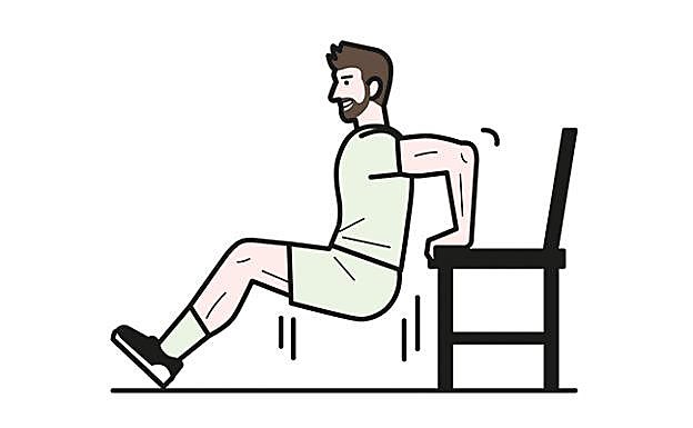 De espaldas a la silla, flexiona las rodillas en ángulo recto hacia delante con los pies abiertos al ancho de las caderas. Apoya las palmas en el extremo de la silla con los dedos mirando hacia delante. Deja caer el peso sobre los talones, elevando la punta de los pies. Flexiona los codos hacia atrás hasta que queden en ángulo recto sosteniendo el peso del cuerpo. Recupera la posición anterior.