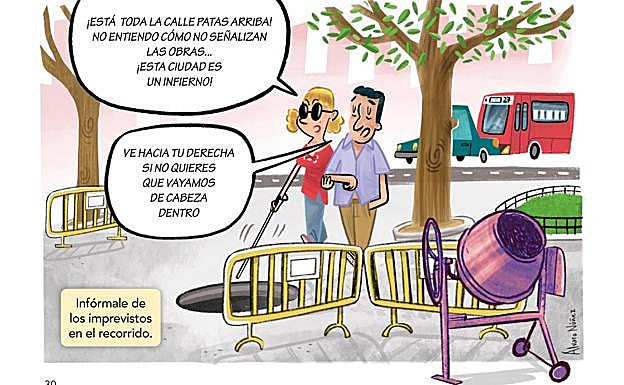 Al guiar a una persona ciega, «sitúate delante de ella y ofrécele tu brazo para que se agarre. Camina a un ritmo adecuado para que pueda seguirte. Si pasáis por un lugar estrecho (obras, aceras estrechas, puertas, pasillos, etc.), dirige tu brazo hacia atrás o indícaselo verbalmente, para que se sitúe detrás de ti. Si prefiere no cogerse del brazo porque solo tiene baja visión, bastará con que te coloques delante», detalla un apartado del libro.