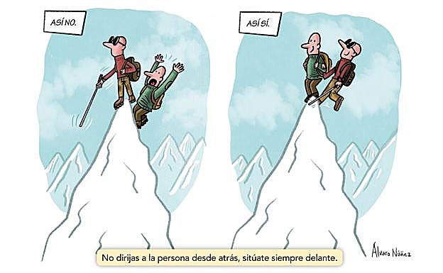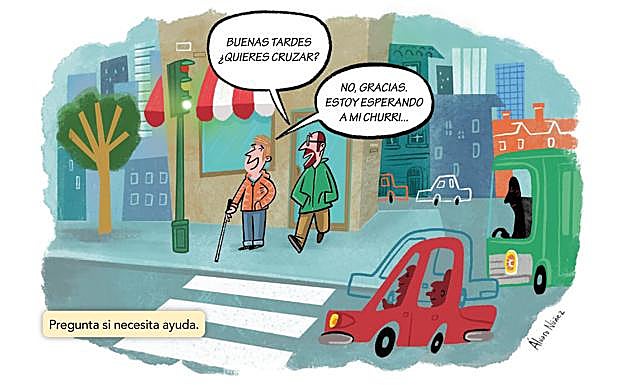 La premisa clave es preguntar siempre antes de ayudar y actuar con naturalidad. «Si en algún momento nos rechazan la ayuda no hay que desanimarse. A veces necesitamos encontrar ciertos puntos de referencia o preferimos hacer algo solos. Es más, en una misma situación, puede que una persona ciega no necesite ayuda, pero otra sí; o que la misma persona necesite ayuda en un momento dado y en otro no», dice González. Y pone un ejemplo para aclararlo: «Puede que yo a las ocho de la mañana no necesite a nadie para cruzar un paso de peatones cuyo semáforo cuenta con una señal acústica. Sin embargo, a las siete quizás sí, pues a esa hora la señal acústica todavía no está activa y no suena».
