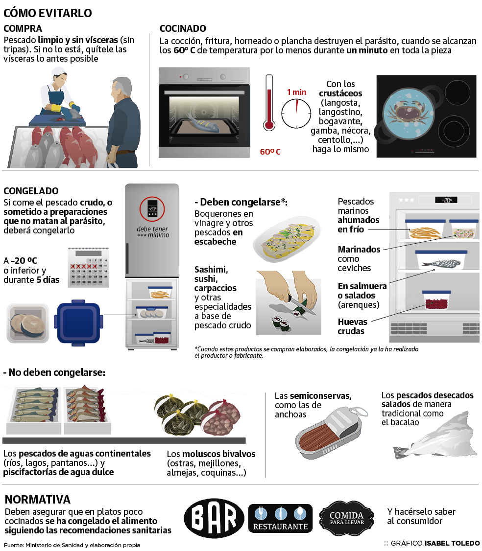 Si come el pescado crudo, o sometido a preparaciones que no matan al parásito (en vinagre, por ejemplo), deberá congelarlo durante cinco días a una temperatura de –20 ºC o inferior. Para ello, su frigorífico debe tener al menos tres estrellas. Si tiene menos, compre el pescado ya congelado.