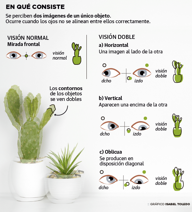 La diplopía es una alteración visual que consiste, básicamente, en la percepción de dos imágenes de un mismo objeto. En otras palabras, la persona que la sufre ve doble. «Y esa doble visión puede ser horizontal, vertical o torsional en función de si las imágenes se superponen una encima de la otra, al lado o en diagonal», explica la oftalmóloga Pilar Gómez de Liaño, presidenta de la Sociedad Española de Estrabología y Oftalmología Pediátrica.