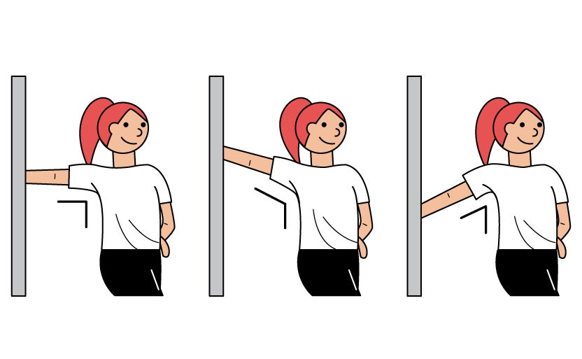 Estire el brazo derecho hacia atrás, a la misma altura de su hombro, y coloque la palma de la mano sobre una pared. Después, gire el cuello lentamente llevando su mirada hacia el hombro izquierdo. Repita la operación dos veces más, una colocando la palma de su mano más arriba de su hombro y, otra, situándola más abajo. A continuación, repita el estiramiento en las tres posiciones con el brazo izquierdo.