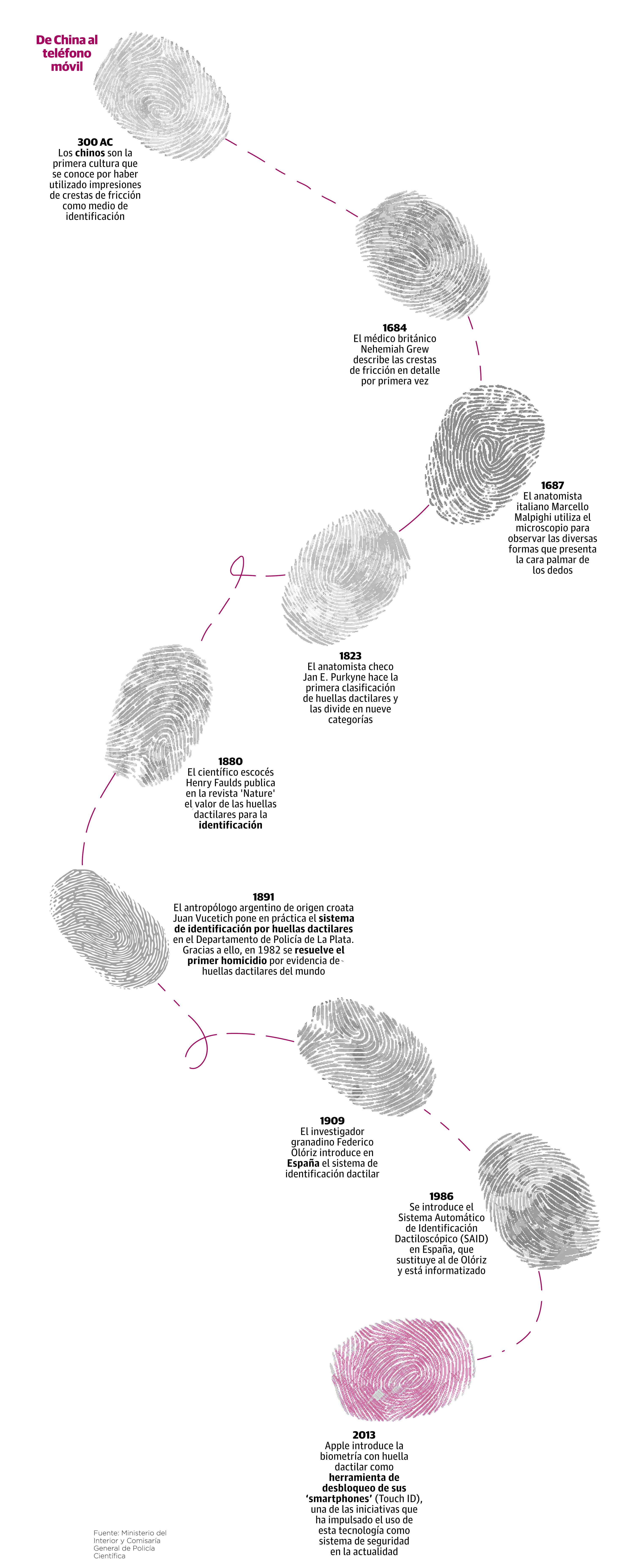Aunque años antes Sherlock Holmes ya andaba con su lupa identificando sospechosos a través del análisis de sus huellas dactilares, no fue hasta 1892 cuando la dactiloscopia se utilizó por primera vez para resolver un homicidio real en Argentina. Desde entonces, los dibujos de las yemas de los dedos, conocidas como crestas papilares, han pasado de ser un sofisticado método de identificación criminal a la manera más rápida de desbloquear un móvil o de saber si un trabajador hace horas extra durante su jornada laboral. Además, desempeña un papel relevante en la identificación de víctimas de catástrofes (seísmos, atentados). El tsunami de Indonesia de 2004 ha sido, hasta ahora, la mayor operación en este sentido. Solo en Tailandia, unos 5.000 afectados fueron identificados gracias a la dactiloscopia, los registros dentales o muestras de ADN.